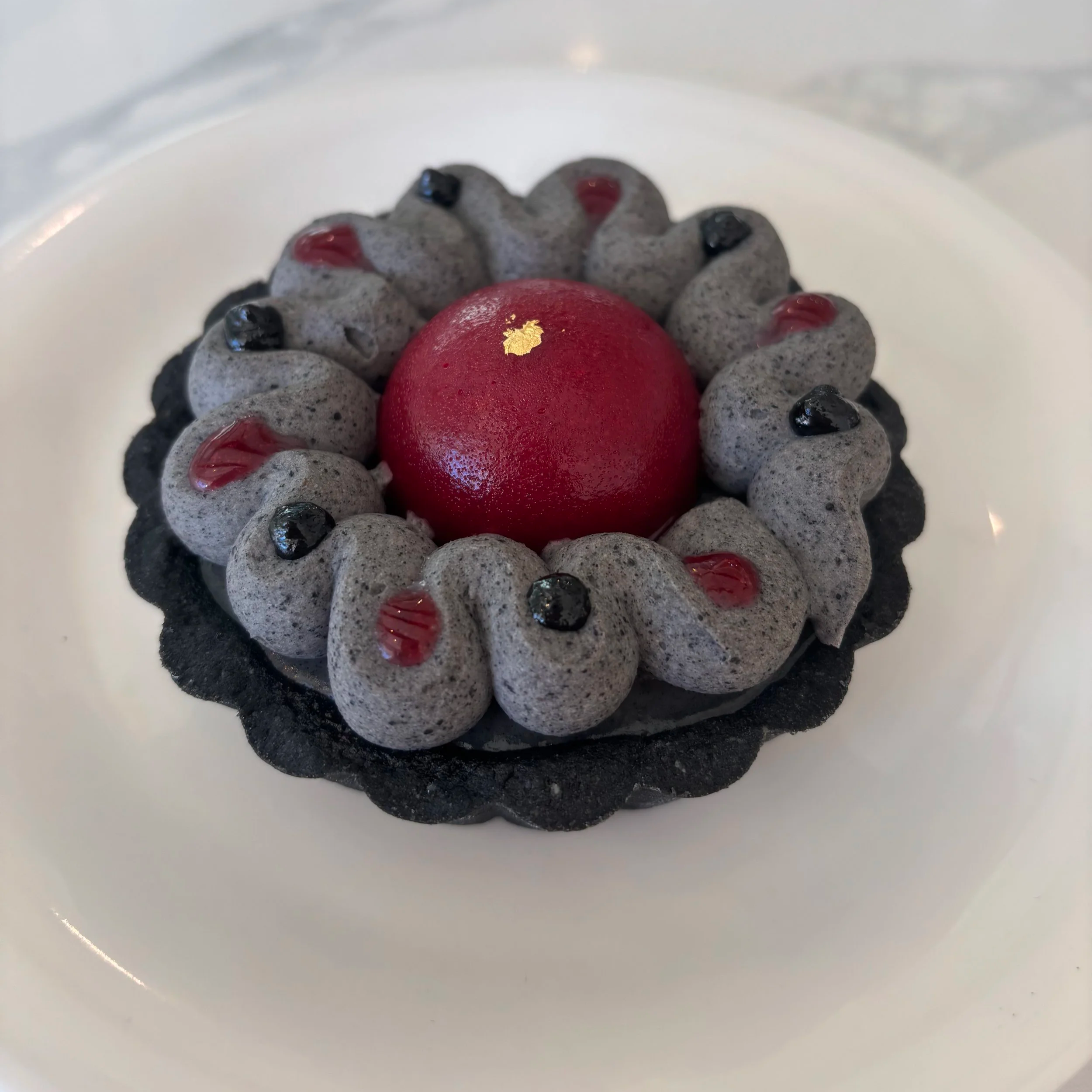 Our signature rare cheesecake filled with blueberry gelée & sauce on a cocoa tart